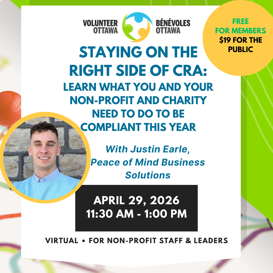Staff and volunteers affiliated with Volunteer Ottawa (VO) member organizations can register for free (Max. 2 staff/volunteers per member organization per workshop).